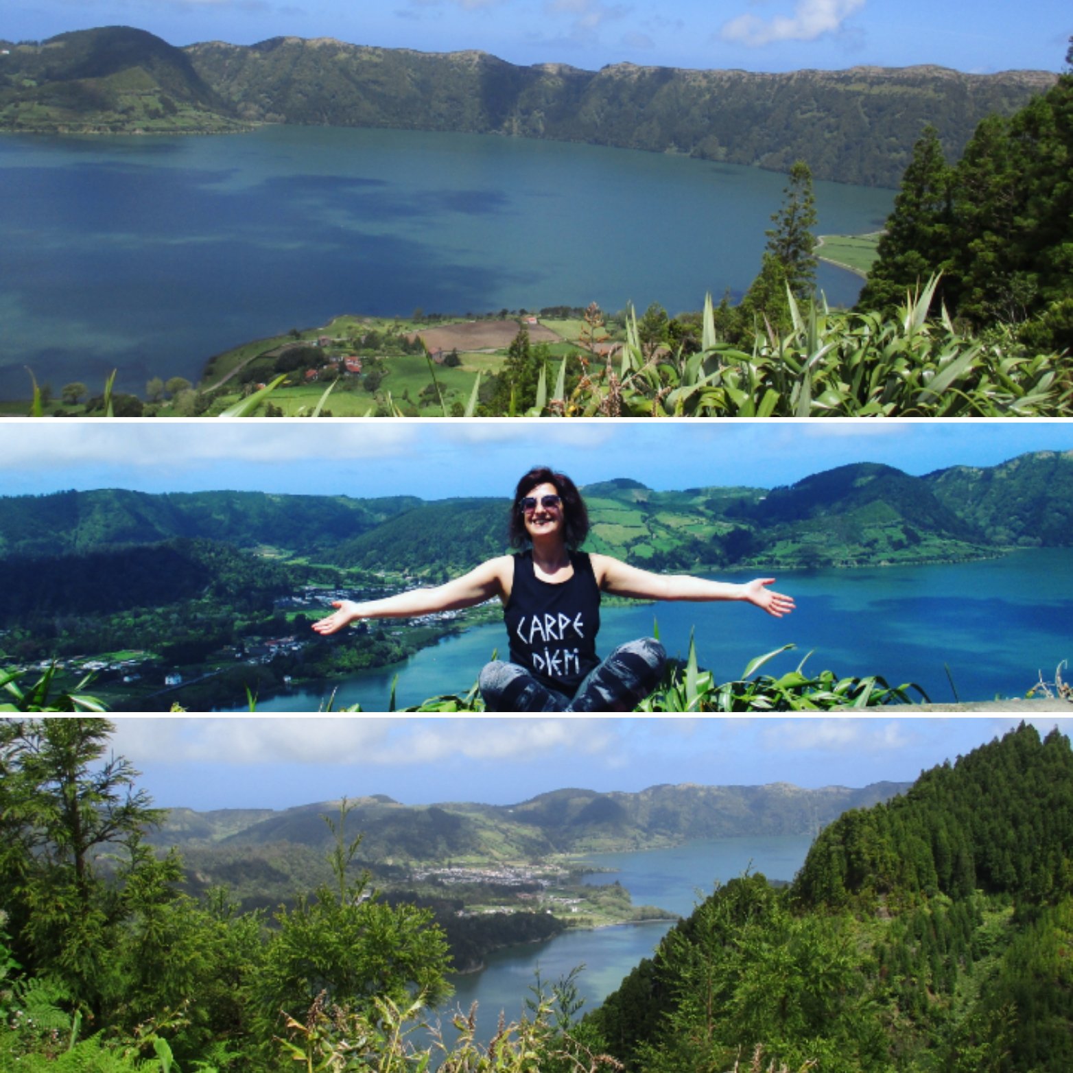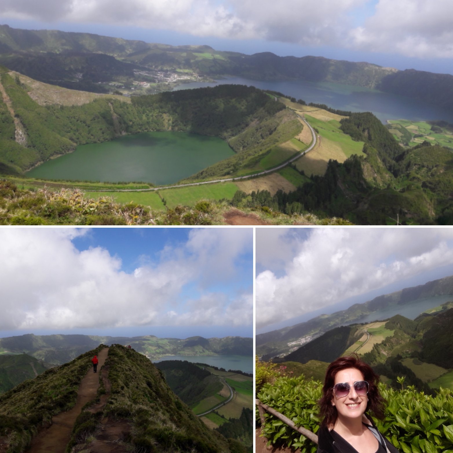 O céu estava praticamente limpo e o sol brilhava e neste miradouro a percepção das cores da lagoa com estas condições atmosféricas é simplesmente fantástica pois conseguimos distinguir perfeitamente a Lagoa Verde e a Lagoa Azul!! Conta a lenda que aqui havia uma linda princesa de olhos azuis que se enamorou por um pastor de olhos verdes, mas o rei não permitiu este romance e concedeu uma última oportunidade dos enamorados se encontrarem… e estes choraram tanto na sua despedida que formaram estas duas lagoas com as cores dos seus olhos!!! 🙂