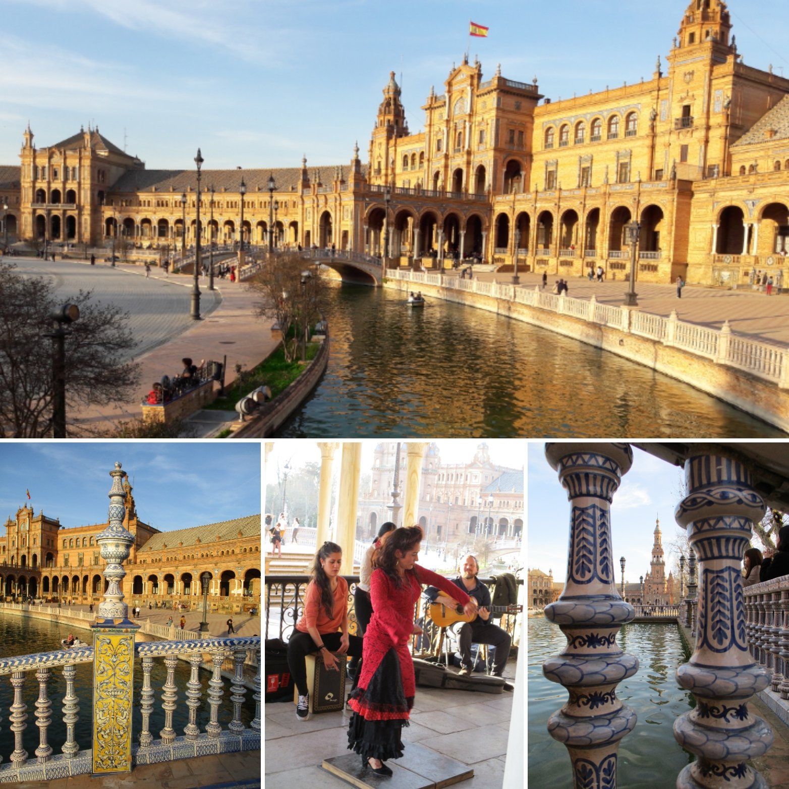 Depois de uma longa visita de várias horas pelo Real Alcázar decidi voltar ao hotel para repor energias e por volta da 16h30 fui em direcção à Praça de Espanha, pois tal como referi, foi ponto de visita e paragem várias vezes! E sem dúvida que com o sol ao fim da tarde, a beleza da praça encanta ainda mais, apesar de ter mais pessoas do que de manhã, continuava a ser tranquilo, talvez por ser início de Fevereiro e dias da semana!! Percorri a praça de uma ponta à outra, sentei-me, apreciei e a melhor surpresa… foi ter assistido a um show de Flamenco na rua, ao ar livre!! Com direito a guitarra, cajón, canto, bailarinas, sapateado, palmas… e de qualidade!! Gostei imenso e estive sentada a ver o espetáculo durante vários minutos!!