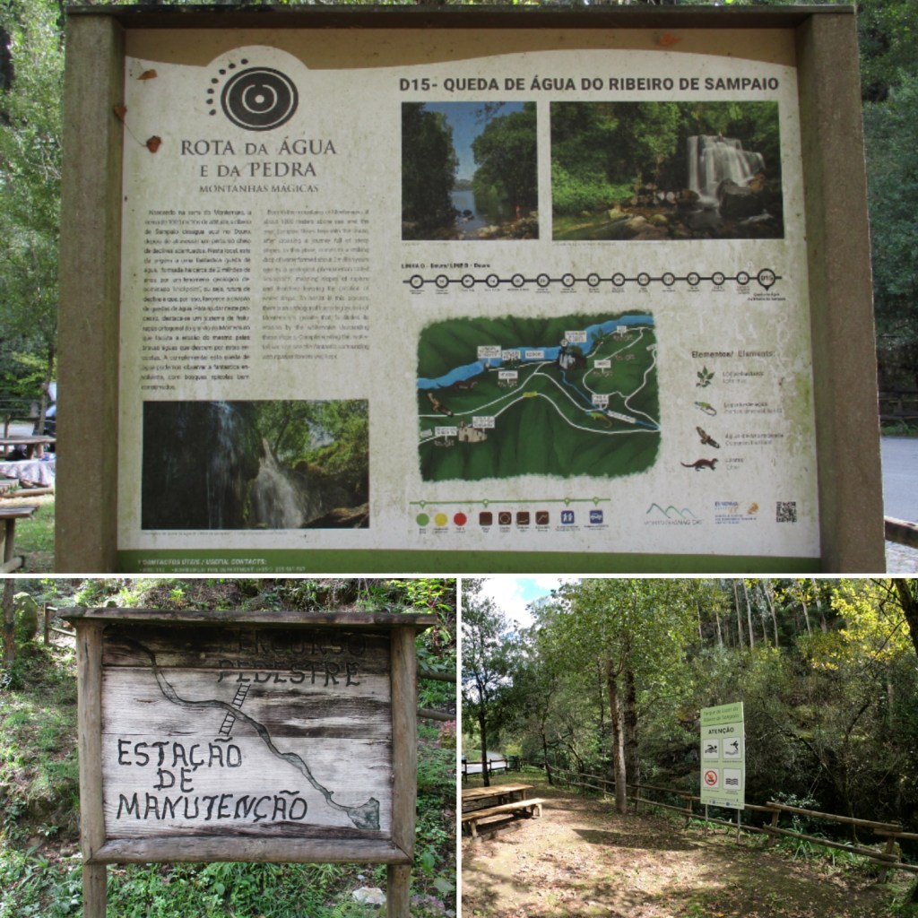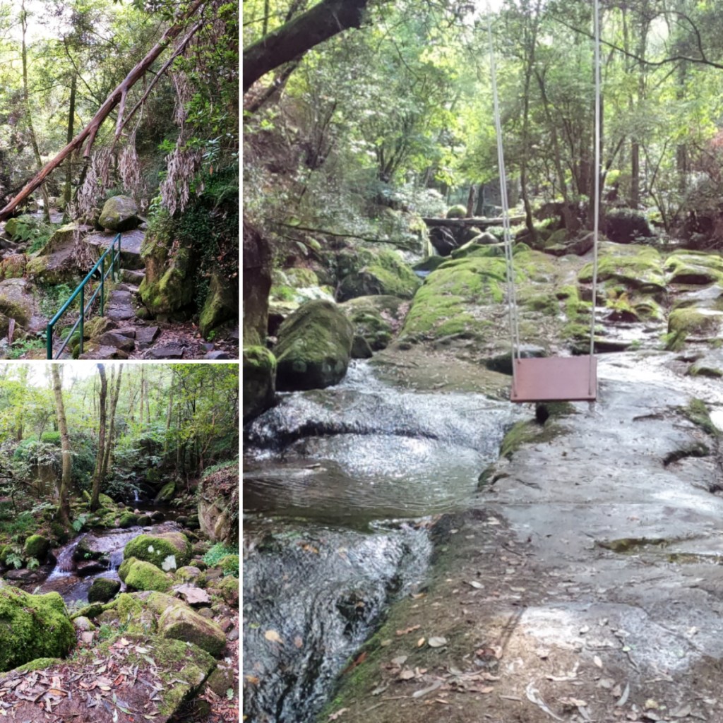 Antes de descer até à pequena lagoa, do lado direito temos o início do trilho que nos leva por uma paisagem verde, entre moinhos abandonados consumidos pela natureza e com a água sempre a acompanhar o percurso! No final fomos surpreendidas por um baloiço, o Baloiço de Sampaio, que apesar de ser apenas uma tábua pendurada em cordas e mal feito, pois a dita tábua não se segura… mais acima a paisagem deslumbra com uma ponte de madeira, bem resistente e mesmo no meio da natureza!!