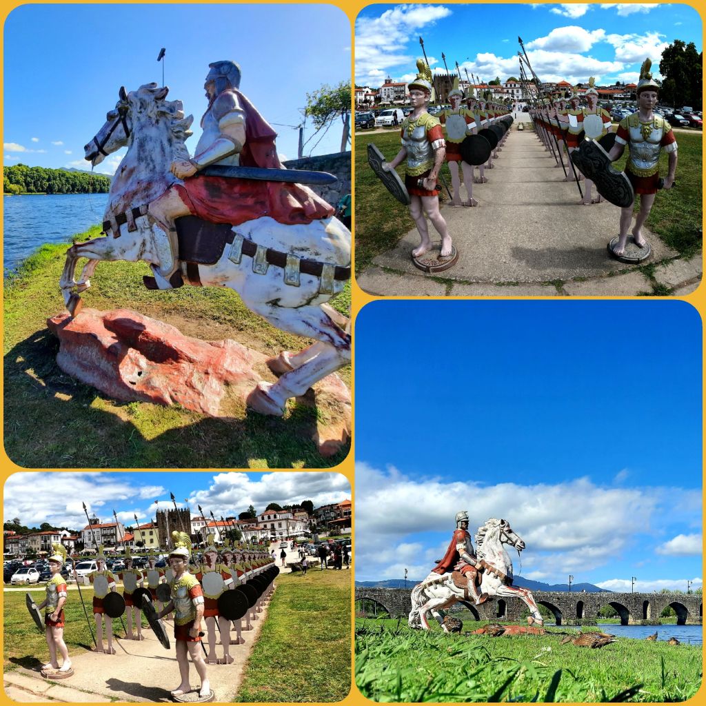 Soldados Romanos: a obra divide-se pelas duas margens do rio Lima! De um lado o General romano Decius Junius Brutus e na margem oposta os seus soldados. Segundo a Lenda do Rio Lethes, no texto de Almada Negreiros, após chegarem à margem esquerda do rio, em 135 a.C. ficaram com receio de o atravessar, pois dizia a lenda que quem o fizesse todas as lembranças da memória seriam apagadas e por isso, os soldados romanos recusaram fazer a travessia… então o General passou sozinho para a outra margem e chamou cada soldado pelo seu nome, demonstrando assim que o “Rio do Esquecimento” era apenas uma lenda e que todos o poderiam atravessar sem receios!